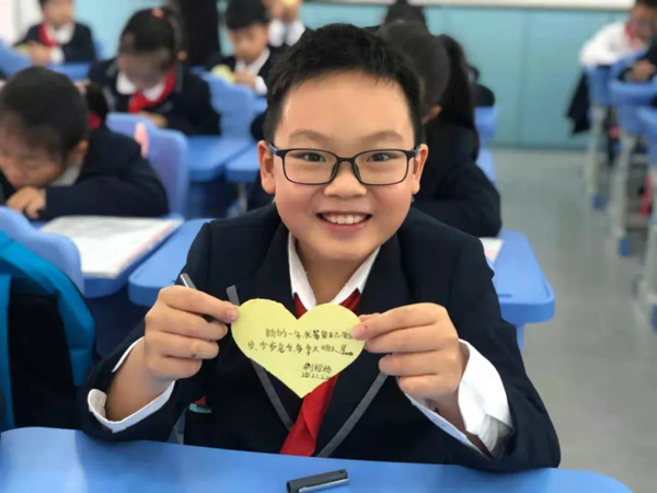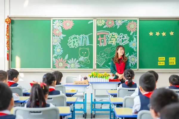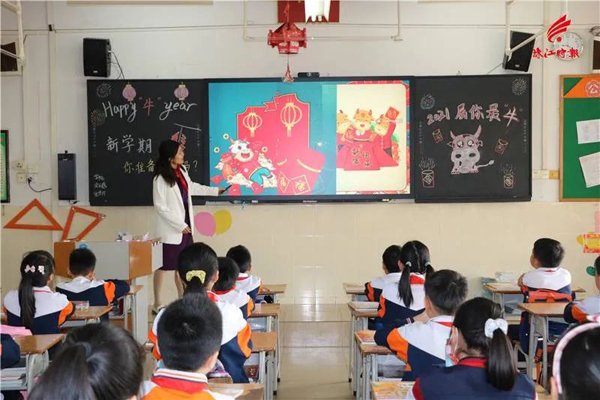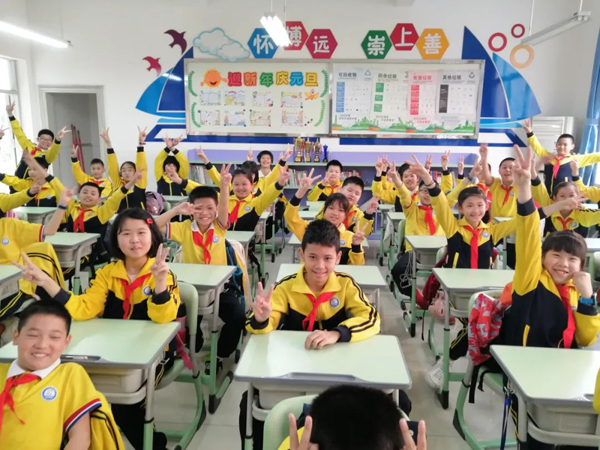 佛山市铁军小学教室里,学生们穿着漂亮的衣服,举着新春祝福,感受新学期的喜悦。