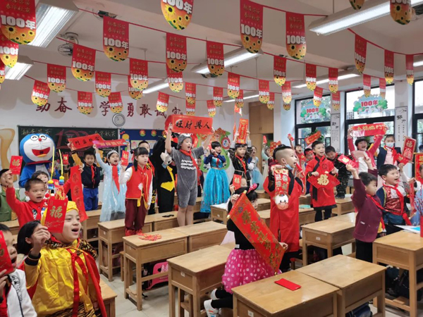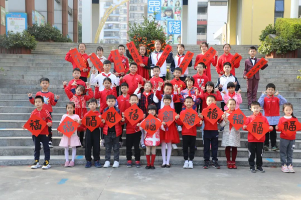 “身体健康!”“学业有成!”顺德区大良街道顺峰小学的同学们举着挥春和福字,送上祝福。