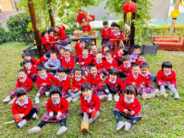 顺德区伦教街道三洲幼儿园精心布置了校园环境,老师带领小朋友在户外拍下一张全家福。