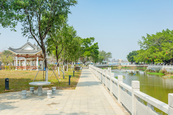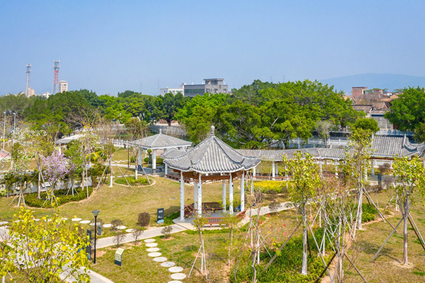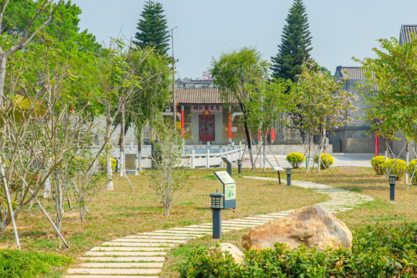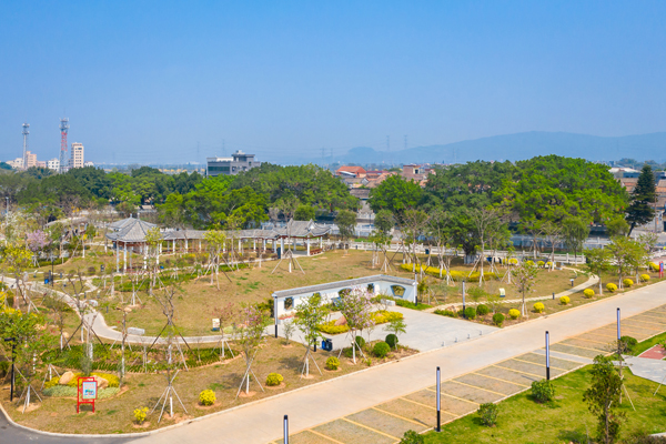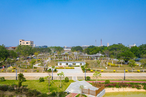 位于三水区乐平镇的大旗头北队公园景观工程(容园),环境优美,绿树成荫鲜花盛开。/佛山日报记者王澍摄
