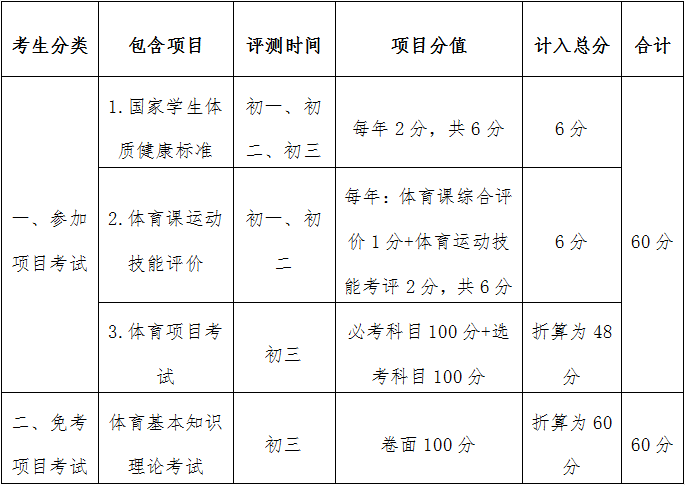 2021年中考体育包括《国家学生体质健康标准》(下称《国标》)、体育课运动技能评价(下称《体评》)和体育项目考试共三部分。因残疾或身体原因不适合参加项目考试的学生,可按相关程序申请免考项目考试,符合条件的学生予以安排参加体育基本知识理论考试。