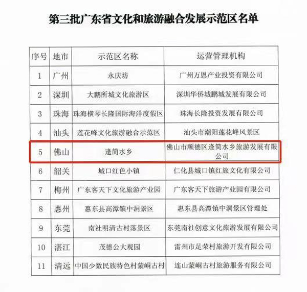 2月22日,广东省文化和旅游厅发布《广东省文化和旅游厅关于公布第三批广东省文化和旅游融合发展示范区名单的通知》,顺德逢简水乡被评为“第三批广东省文化和旅游融合发展示范区”称号,成为第三批中佛山市唯一的代表。