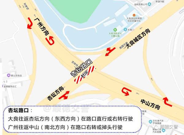杏坛路口封闭施工期间,仅允许东西方向(大良往返杏坛方向)在路口直行或右转行驶,南北方向(广州往返中山)在路口右转或掉头行驶,受影响车辆可以按以下方式行驶: