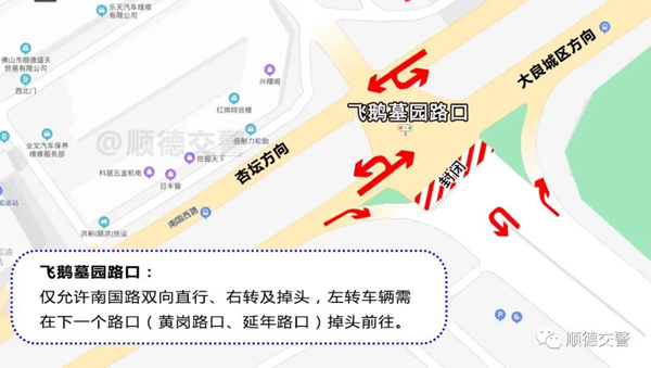 大良城区往容桂、中山方向(东往南方向)的车辆,需直行至南国西路飞鹅墓园路口掉头后前往。