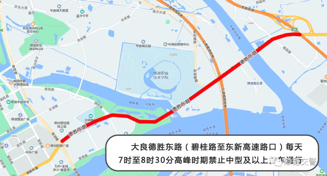 日前,顺德交警对外发布通告:大良德胜东路(碧桂路至东新高速路口),每天7时至8时30分,禁止中型及以上货车通行。
