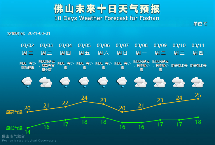 佛山市气象台3月1日预报,3月1日夜间到3月2日受新一股冷空气影响,佛山有小雨和轻雾,气温小幅降至14℃~20℃。3月3日阴天到多云,局部有零星小雨,气温轻微升至16℃~21℃。3月4日~5日阴天,有小雨,气温继续逐日小幅回升。3月6日至7日受新一股冷空气影响,有小雨,气温逐日缓降。展望3月8日至11日维持阴天间多云天气,前期仍有零星小雨骚扰,气温逐日缓慢回升。