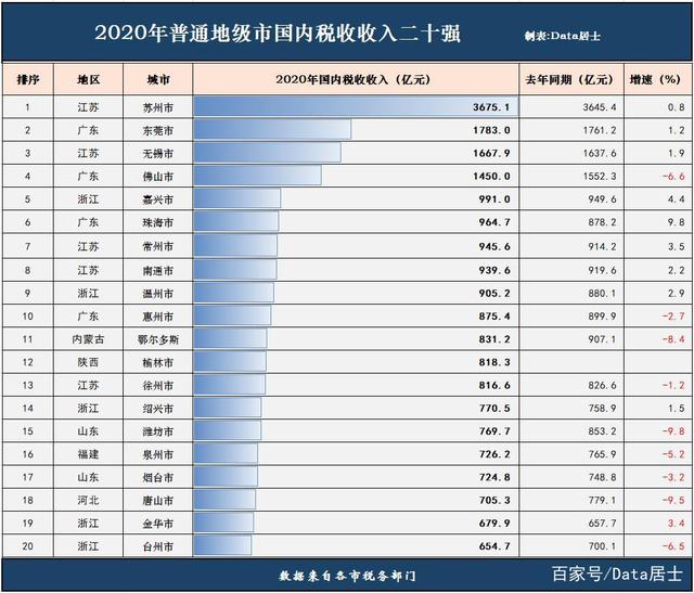 我国有200多个普通地级市,能入围前二十强的必定是地级市中的翘首。但因为之前不少排名都是和省会、直辖市等一起,地级市因为城市能级较低比较吃亏,所以本文是单独的普通地级市2020年国内税收排名,不包括地级市省会以及特区地级市珠海,因为以上都有吸税功能,非一般地级市可比。