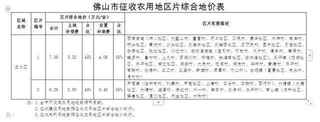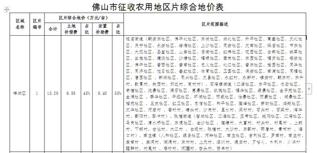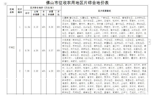 祖庙街道 朝安东社区、佛平北社区、东城社区、城北社区、升平社区、高基社区、文北社区、庆宁社区、永安社区、培德社区、上沙社区、同安社区、文南社区、妈庙社区、市东社区、大观社区、圣堂社区、山紫社区、后街社区、红棉社区、花园社区、白燕社区、铁军社区、兰桂社区、建设社区、沙塘社区、福禄社区、莺岗社区、东园社区、福贤社区、塔坡社区、佛平社区、普西社区、普南社区、忠义社区、北江社区、普东社区、桂园社区、同华社区、同济社区、旭日社区、垂虹社区、体育社区、卫国社区、保安社区、南浦社区、同福社区、唐园社区 、新城社区、同兴社区、文昌社区、永红村、永新村、镇安村、朝东村、东升村、敦厚村、扶西村、郊边村、简村村其中土地补偿费6.88万元/亩,安置补助费8.40万元/亩。