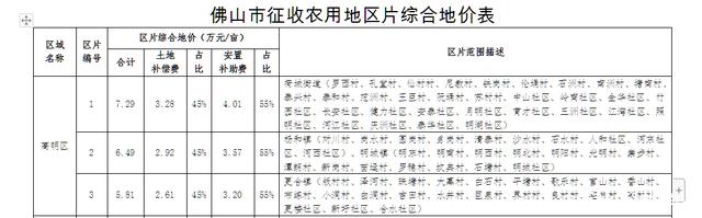 伦教街道 三洲社区、常教社区、永丰村、鸡洲村、熹涌村、霞石村、荔村村、新塘村、羊额村、仕版村其中土地补偿费4.39万元/亩,安置补助费5.37万元/亩。