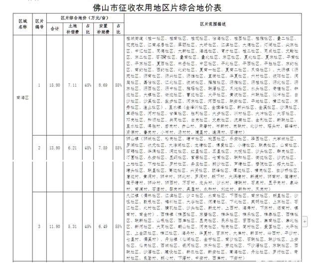 石湾镇街道 江滨社区、东平社区、依云社区、奇槎社区、泷景社区、澜石社区、惠景社区、玫瑰社区、福华社区、绿景社区、金子苑社区、金澜社区 、季华社区、平远社区、环湖社区、丽银社区、怡景社区、丽豪社区 、湖景社区、榴苑社区 、三友社区、红卫社区、忠信社区、和平社区、莲峰社区、劳动社区、鸿翔社区、文华社区、河宕村 、番村村、塘头村、沙岗村、里水村、深村村、石头村 、石梁村、湾华村、鄱阳村、黎冲村其中土地补偿费6.88万元/亩,安置补助费8.40万元/亩。