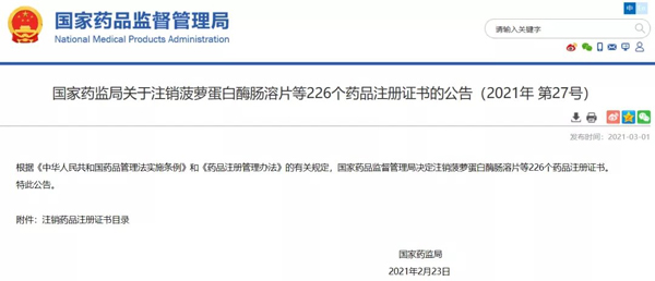 概述:近日,国家药监局官网发布《关于注销菠萝蛋白酶肠溶片等226个药品注册证书的公告(2021年 第27号)》,一批药品依照企业申请退市停售......
