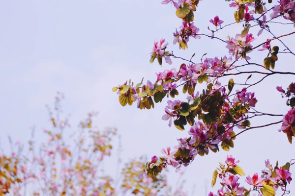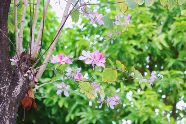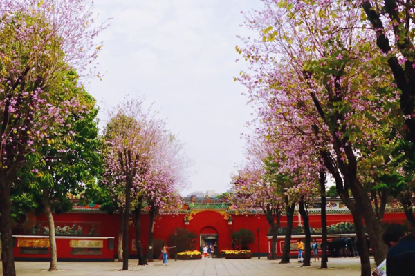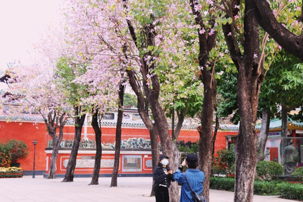 漫步于祖庙,眼眸所及的,尽是满树嫣然,宫粉紫荆以如期而至的芬芳回馈热情的游客。