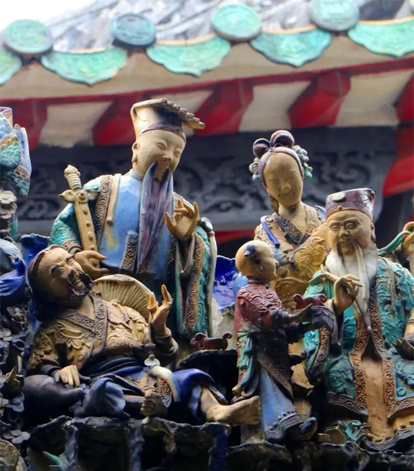 设于祖庙各处的陶塑瓦塑历经百年风雨,其釉色仍光亮如新,色彩高贵华丽,古朴典雅。惟妙惟肖的陶塑在宫粉紫荆的衬托下更显古韵,尽显佛山文化之美。
