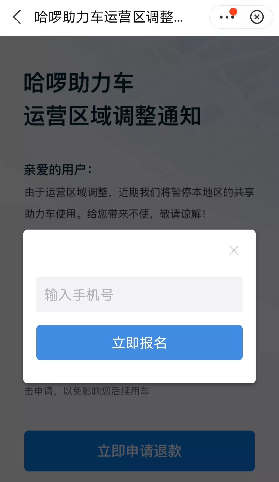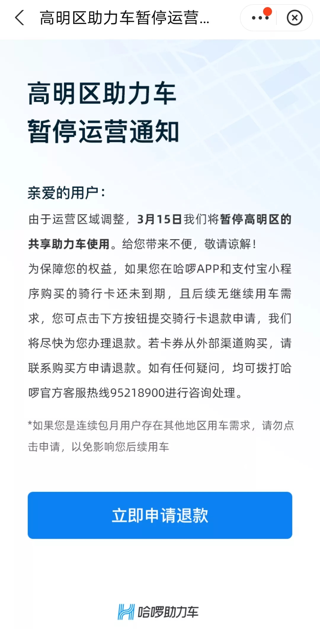 概述:通知上主要说:由于运营区域调整,3月15日将暂停高明区的共享助力车使用。除此之外,信息还提供了哈啰助力车骑行卡的退款渠道。......