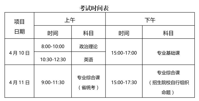我校招考专业对应的专业基础课、专业综合课均实行省统一命题考试,各招考专业对应的具体科目详见附件 1 或报名时登录报名系统查阅,考试时间按省考试院规定时间执行。
