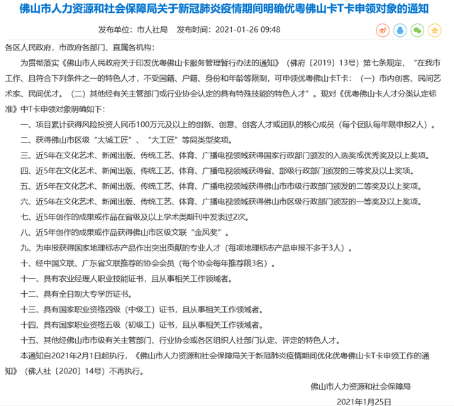 例如,今年1月26日,佛山市人社局发布了关于新冠肺炎疫情期间明确优粤佛山卡T卡申领对象的通知。