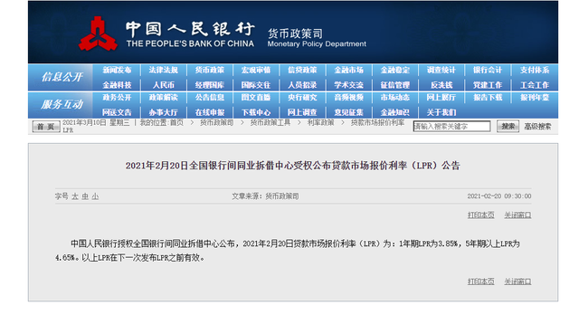 据央行2月20日公布,维持一年期和五年期贷款市场报价利率(LPR)分别为在3.85%和4.65%不变。