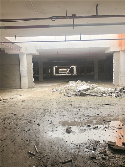 走入楼层查看,不少楼层的公共区域都铺满了刮灰打磨留下的白色粉末和废料。走进房间查看,每家每户的门上都贴着“住宅工程质量分户验收标识”的表格,房间不少墙体也贴着写有一些检查结果的白色表格。房间内,尽管水电已经走好,不过强电箱和弱电箱并没有入墙,乍一看有些突兀。在19栋6楼的楼层里,一盏应急灯掉了下来悬挂在空中。顶楼上的一些电线还裸露在外,电梯间也未进行相应的封闭,一些穿墙空洞也未进行填补。记者走访看到,整个小区最乱的地方就在地下车库,尽管车库顶部已经装好了消防的喷淋设施,不过整个地下车库十分杂乱,通往出口的道路仍未修平。