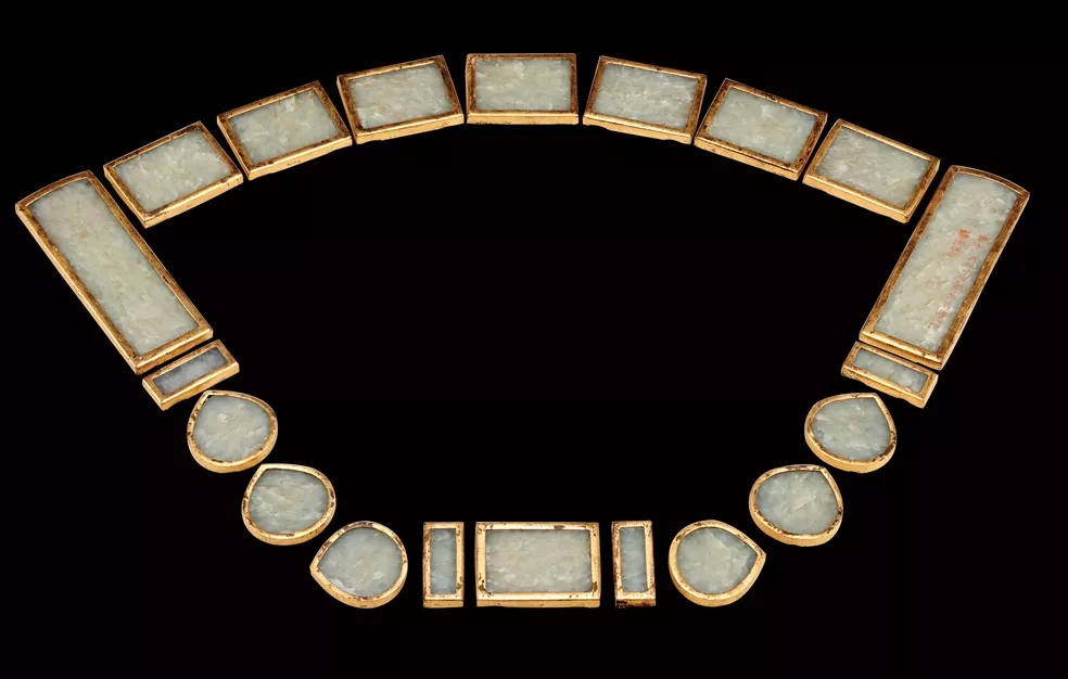 玉带是一种由数块乃至十数块扁平玉板镶缀的腰带,是古代社会等级和地位的象征,北帝神像所御之玉带组件,共由20片素面包铜鎏金青玉带板组成。