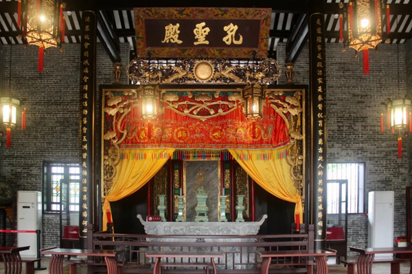 神龛上方悬挂“孔圣殿”木牌匾,龛前则安放一张理石浮雕双龙戏珠纹翘头神案,亦系佛山店号“夏怡和”于清光绪二十三年(1897年)所造。殿内两侧墙上,镶嵌有《孔子庙堂碑》拓本刻石十二块,据唐代书法家虞世南所书碑记拓本翻刻,上有翁方刚的考证题跋;殿内石柱、木柱上共有七副对联,均为清宣统三年修庙时当地士绅所书,笔法遒劲、博古通今,书香文化气息浓厚。