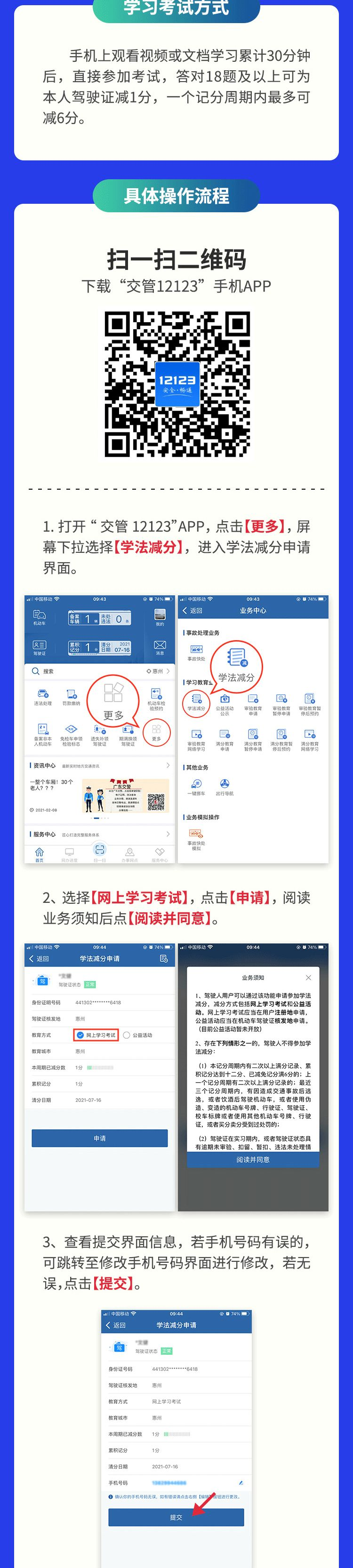 提交申请后,系统将自动核查申请人是否符合学法减分的申请条件,申请结果将于24小时之内通过“交管12123”手机APP消息方式告知,请注意及时查看申请审核情况。申请成功之日起,申请人需在3日内完成累计30分钟的交通安全知识学习(连续学满5分钟的,才计入累计学习时间),否则申请信息和学习记录自动作废。