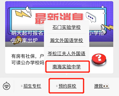 Step2:选择“预约探校”栏目,点击“南海实验中学”进行预约信息登记即可报名。