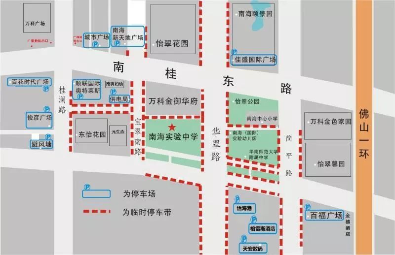 学校周围500米左右的停车场:百花时代广场、俊彦广场、城市广场、南海新天地广场、顺联奥特莱斯、佳盛国际广场、金百福广场、怡海港、天安数码城等。