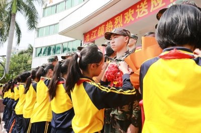 在九江送兵现场,少先队员给新兵们戴上红花。 珠江时报记者/朱明菲摄