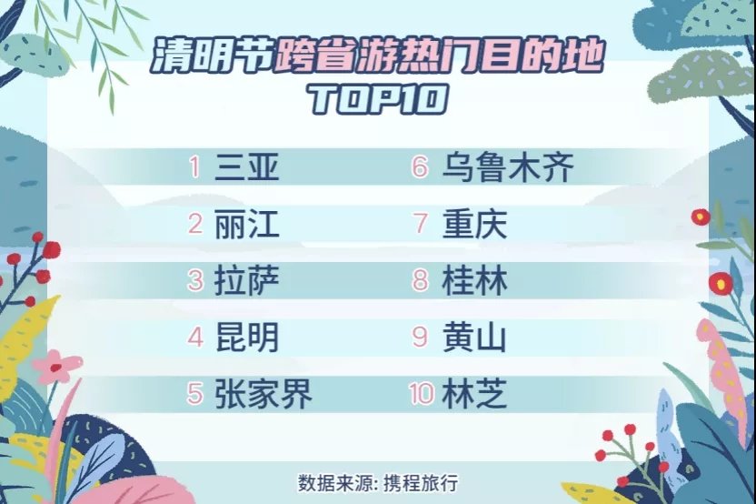清明节将迎来今年跨省游的首次高峰。数据显示,清明节跨省游热门目的地有:三亚、丽江、拉萨、昆明、张家界、乌鲁木齐、重庆、桂林、黄山和林芝。