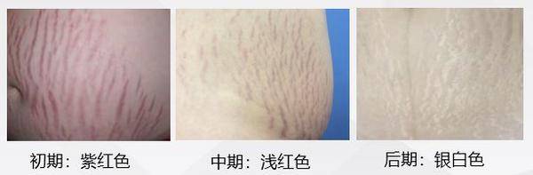 妊娠纹早期阶段表现为暗红色或紫红色,晚期呈白色或银色,且可以根据其不同时期的临床表现进行分型。