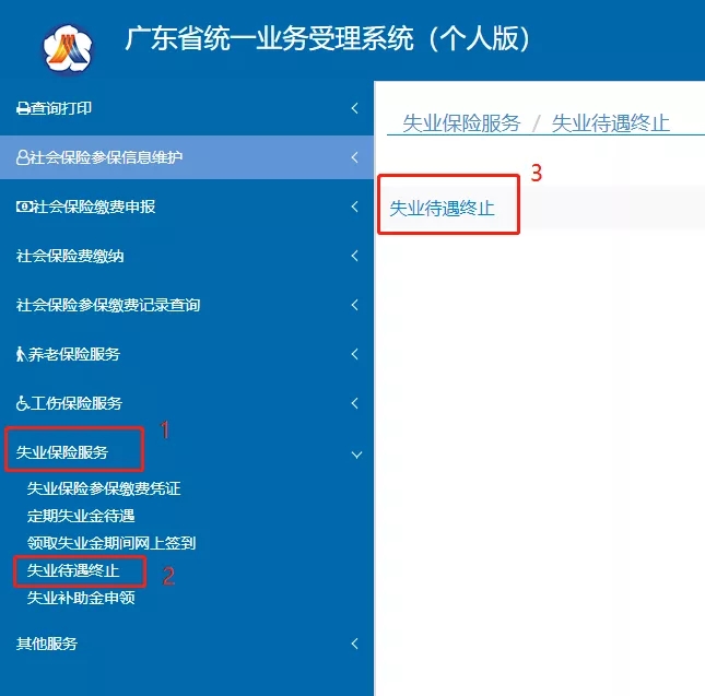 第三步:登录后,选择“失业保险服务”-“失业待遇终止”,点击“失业待遇终止”;