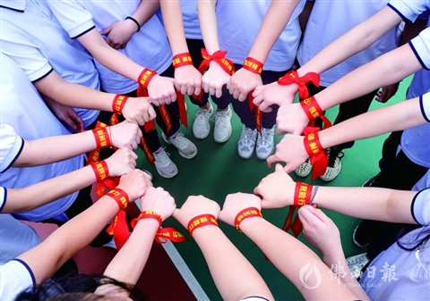昨日,汾江中学初三年级904班的学生们手拉手一起为即将到来的中考加油。/佛山日报记者谭兼之摄
