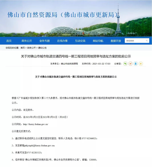 佛山地铁4号线一期29个站点+出入口位置正批前公示。