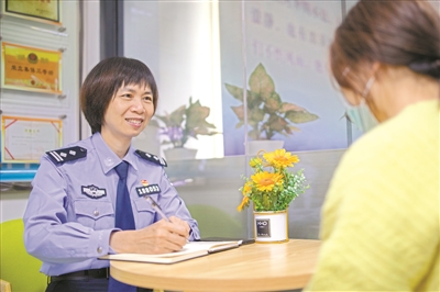 “聆听小屋”服务队的女民警在倾听群众意见。