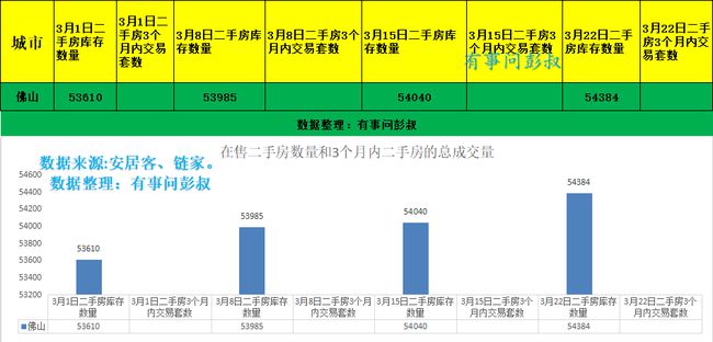 二、佛山楼市近三周在售二手房数量为53985套,54040套,54384套,持续上涨。