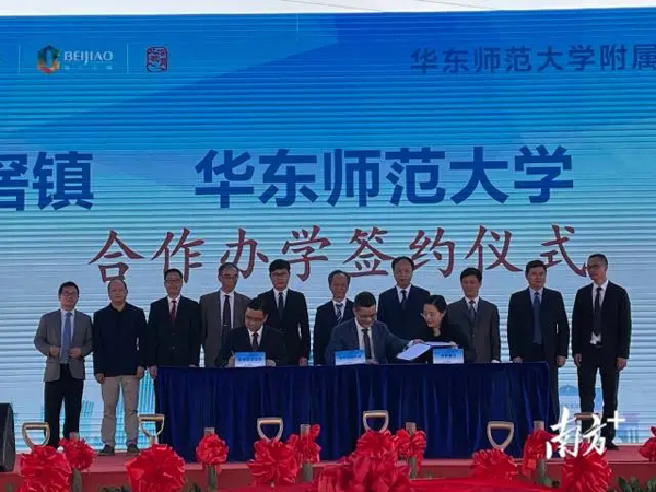华东师大顺德美的学校是华东师大在粤港澳大湾区的第二所附属学校,由顺德区、北滘镇国资企业投资兴建,引进华东师大合作办学,采取非营利性的“国有民办”模式。华东师大输出办学品牌、管理团队、办学资源。美的集团通过搭建资源平台、设置奖教奖学基金等形式支持筹建学校建设和发展。政府、企业、高校三方在现场签订了合作协议。