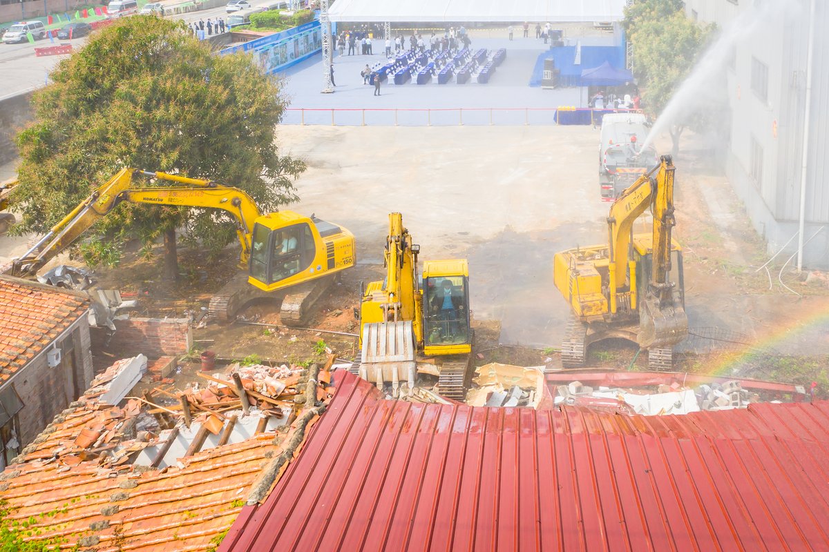 3月26日,三水区村级工业园升级改造攻坚提速活动在乐平镇汉南湾科创社区举行,挖掘机对老旧厂房进行拆除。/佛山日报记者王澍摄