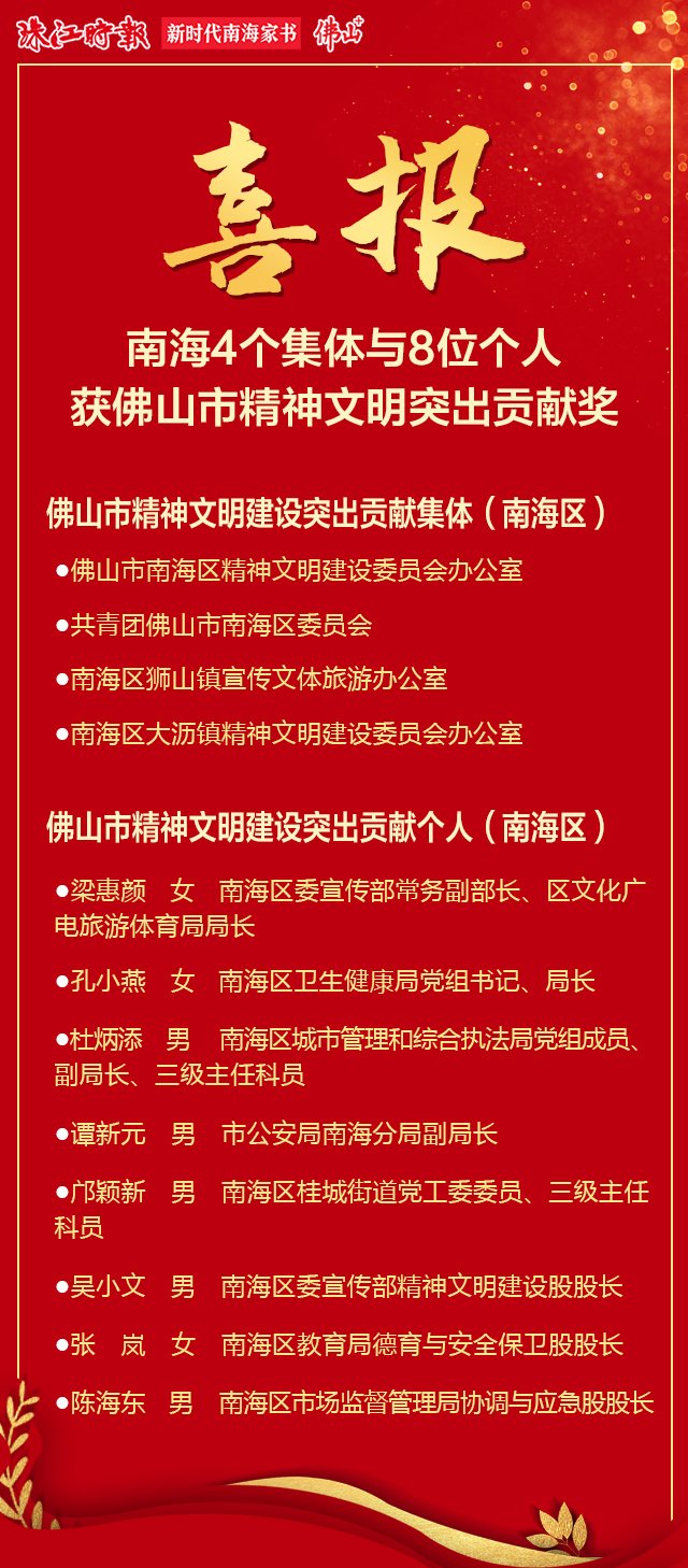 珠江时报记者留意到,在受表彰的名单中,南海区精神文明建设委员会办公室等南海区的4个单位荣获“佛山市精神文明建设突出贡献集体”称号,南海区委宣传部常务副部长、区文广旅体局局长梁惠颜等8人荣获“佛山市精神文明建设突出贡献个人”称号。