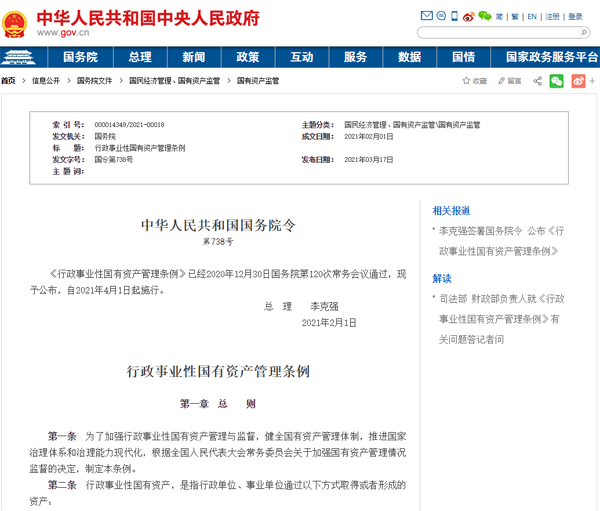 《行政事业性国有资产管理条例》,将自2021年4月1日起施行。