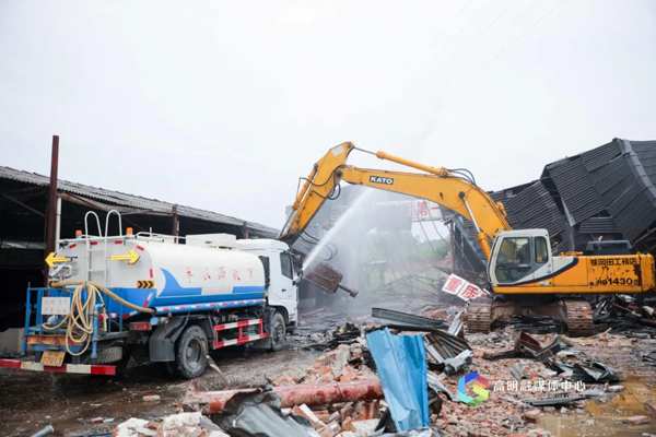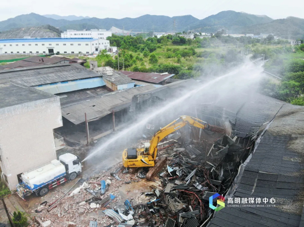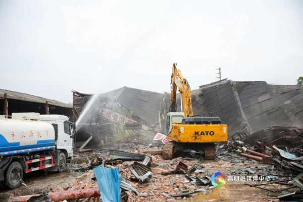 在荷城仙村德胜岗工业园,大型挖掘机驶进工业园,开始清拆一处废旧的工业厂房。