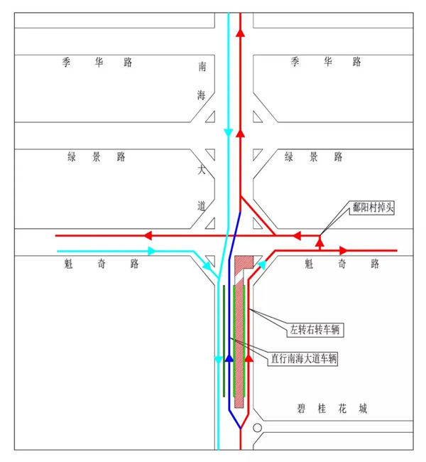 施工期间,需对南海大道-魁奇路交叉口南进口全部车道进行围蔽,届时,南往北方向直行,需借用对向2个车道;南往东右转,继续走右转弯专用车道;南往西不能直接左转,需右转至魁奇路后掉头。
