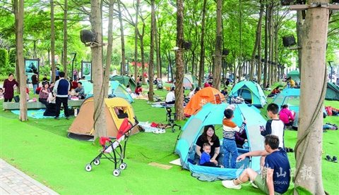 清明假期最后一天,市民在佛山新城滨河景观带野餐、露营。/佛山日报记者林夏威摄