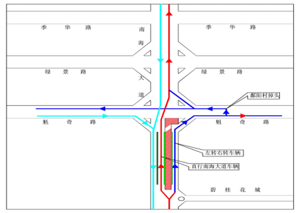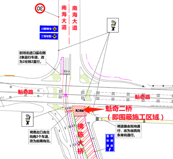 由于魁奇二桥需要维修,计划于2021年4月6日至4月30日对魁奇二桥进行部分围蔽施工,工期为24天。施工期间,需对南海大道-魁奇路交叉口南进口全部车道进行围蔽,届时,南往北方向直行,需借用对向2个车道;南往东右转,继续走右转弯专用车道;南往西不能直接左转,需右转至魁奇路后掉头。