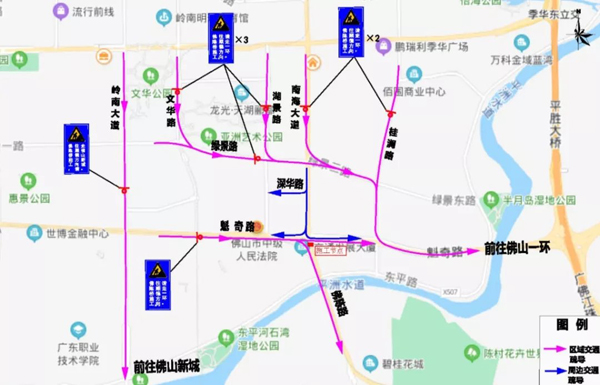 往佛山一环方向:①文华路/湖景路/南海大道/桂澜路—魁奇路—佛山一环②绿景路/魁奇路—魁奇路—佛山一环