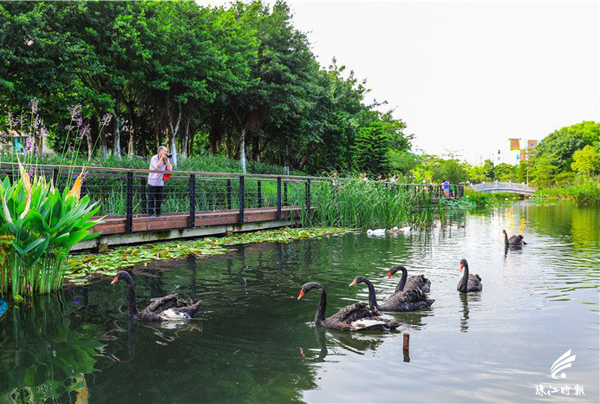 盛夏的映月湖畔,市民沿着栈道漫步赏花,黑天鹅不时穿梭湖中。