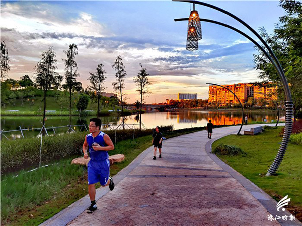 沿桥拾级而下,夕阳下的博爱湖迎来一批跑者,用脚步丈量城市客厅的质感。