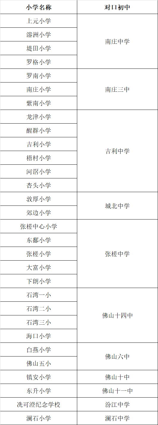 南庄片区、张槎片区全部小学,祖庙片区、石湾片区部分小学应届毕业生对口直升该片区初中,城北中学联盟内小学应届毕业生对口直升初中