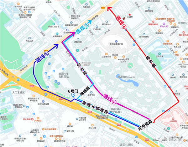 1、由龙盘路进入兴顺路,经兴顺路往顺德大道仙泉路口掉头后前往;