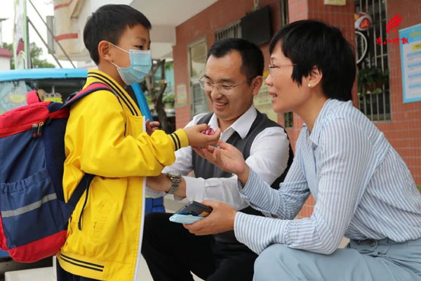 在民乐小学,西樵镇党委委员张惠冰与孩子交流。