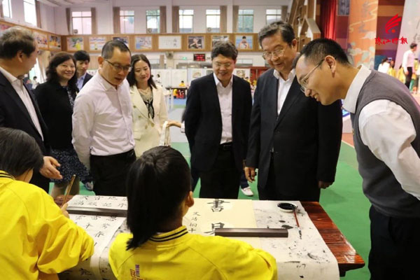 民乐小学兰亭书法苑的孩子即席挥毫,吸引了专家领导的目光。